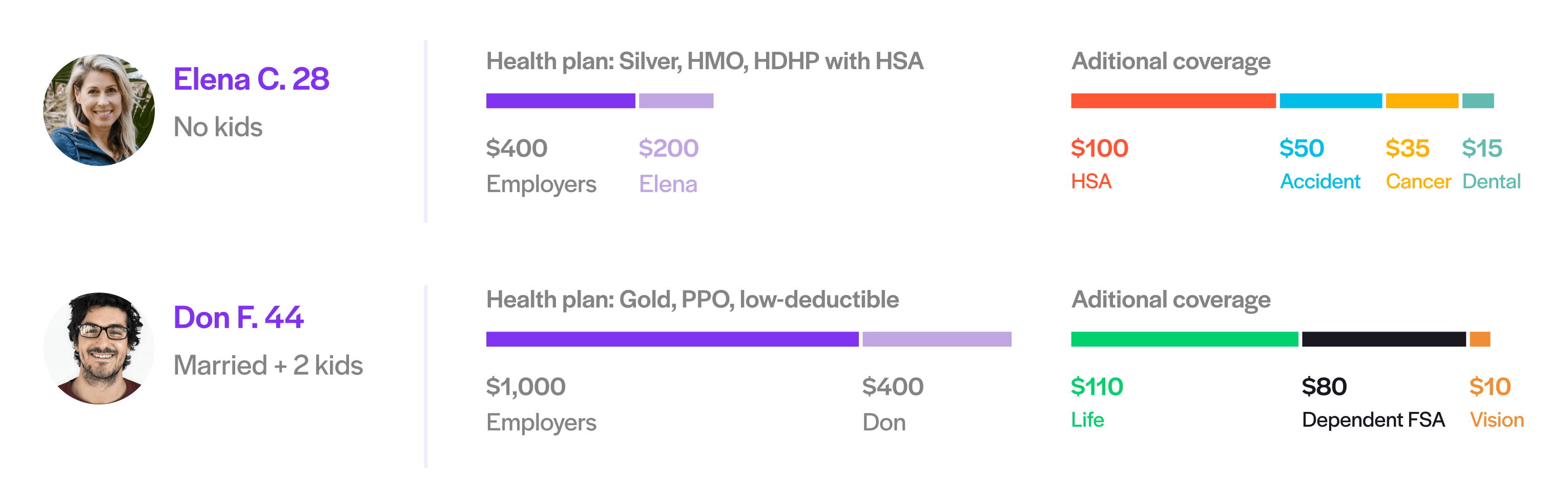 Elena, the young, single employee, would pay $200 for her health plan, contribute to an HSA, and allocate an additional $200 in supplemental benefits across the types of coverage that best fit her lifestyle and personal health profile–accident, dental and cancer.